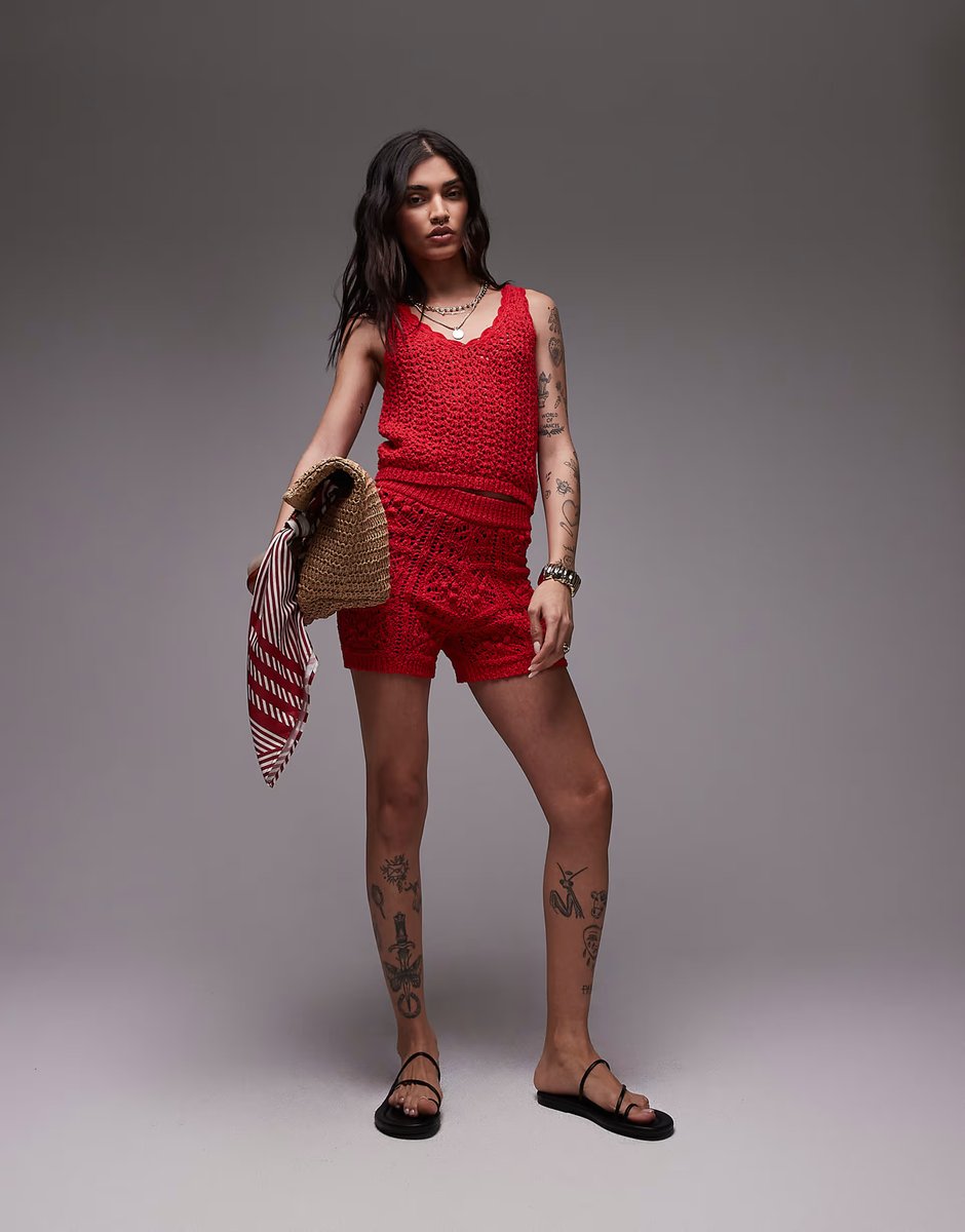 The ASOS Knitted Crochet Short and Tank in Red is ideal for casual, beach.