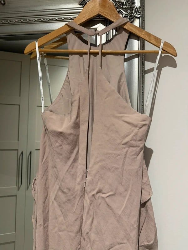 This beige linen maxi dress by ASOS features a twist detail high neck and a sheer back for a touch of elegance. The maxi length and sheer detailing make it perfect for summer events.