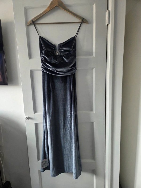 Charcoal/steel gray velvet midi dress with delicate straps and a flattering ruched front detail. Soft, luxe feel—perfect for nights out, events, or special occasions.
