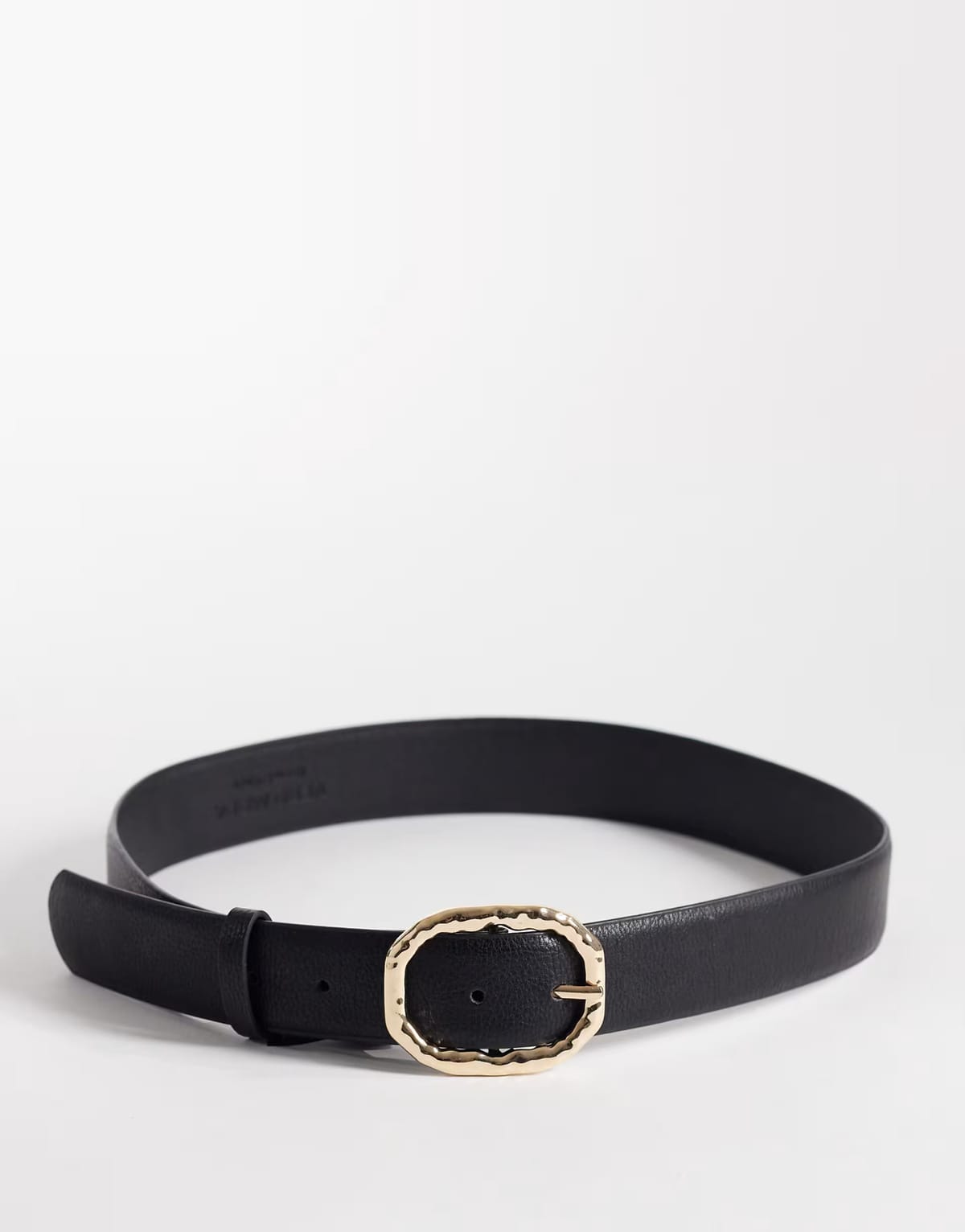 View ASOS's returns policyElegant black faux leather belt from Vero Moda featuring a gold hammered metal buckle. Perfect for adding a touch of sophistication to any outfit.