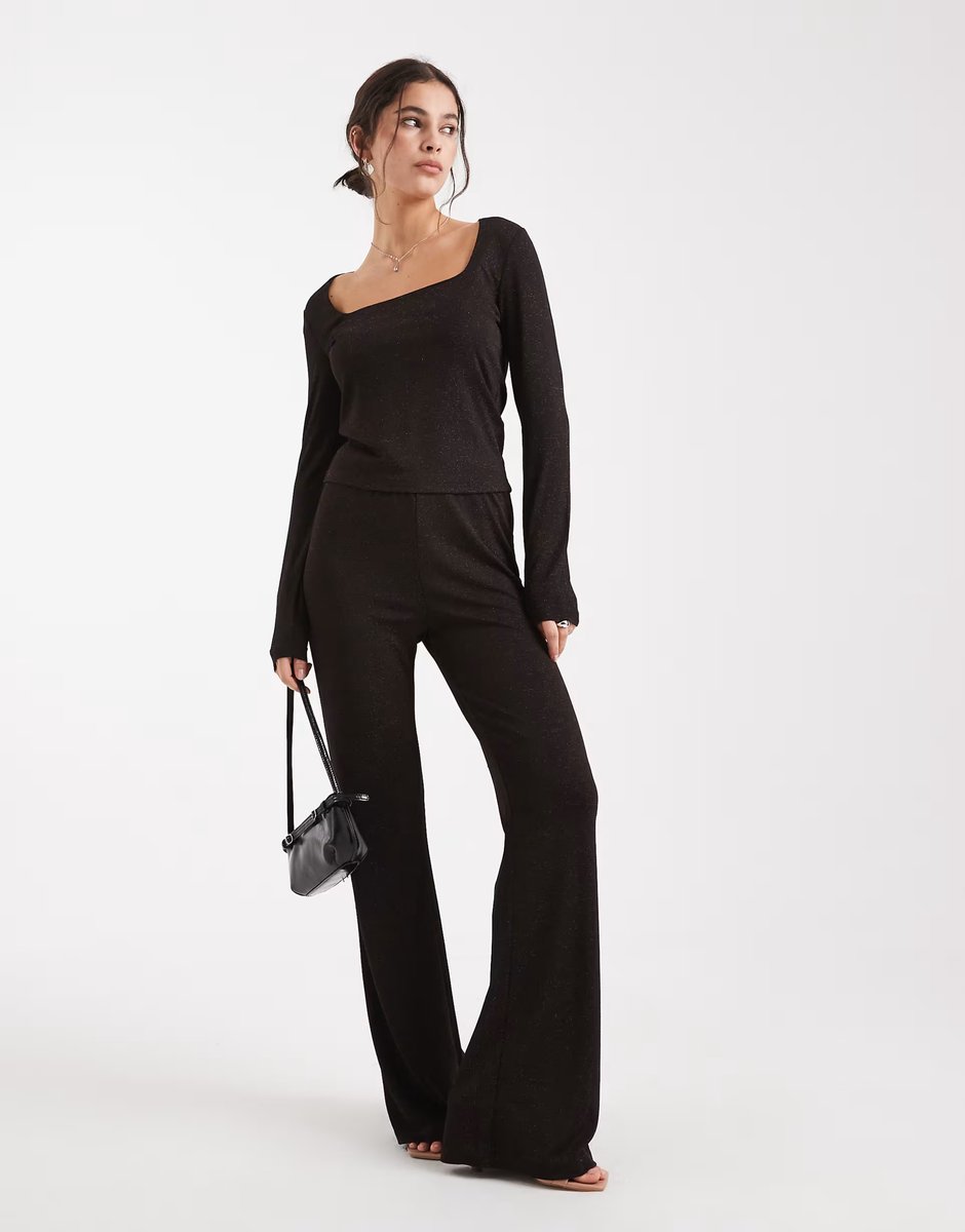 This chocolate and copper glitter long sleeve square neck top and wide leg trousers set from Vero Moda by ASOS is perfect for a chic and glamorous look. The square neck top is paired with wide leg trousers for a modern and elegant ensemble.