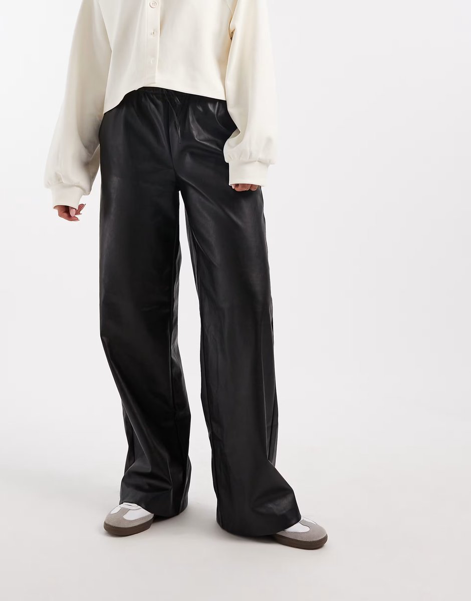 The ASOS Vero Moda Tie Waist Wide Leg Faux Leather Trousers in Black is ideal for work, casual.
