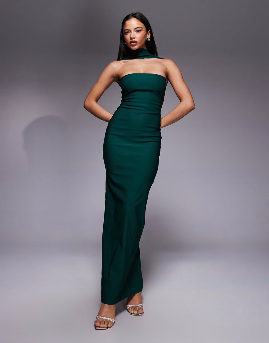 The Vesper Bengeline Bandeau Choker Detail Back Button Detail Maxi Dress in Forest Green is ideal for evening, party.