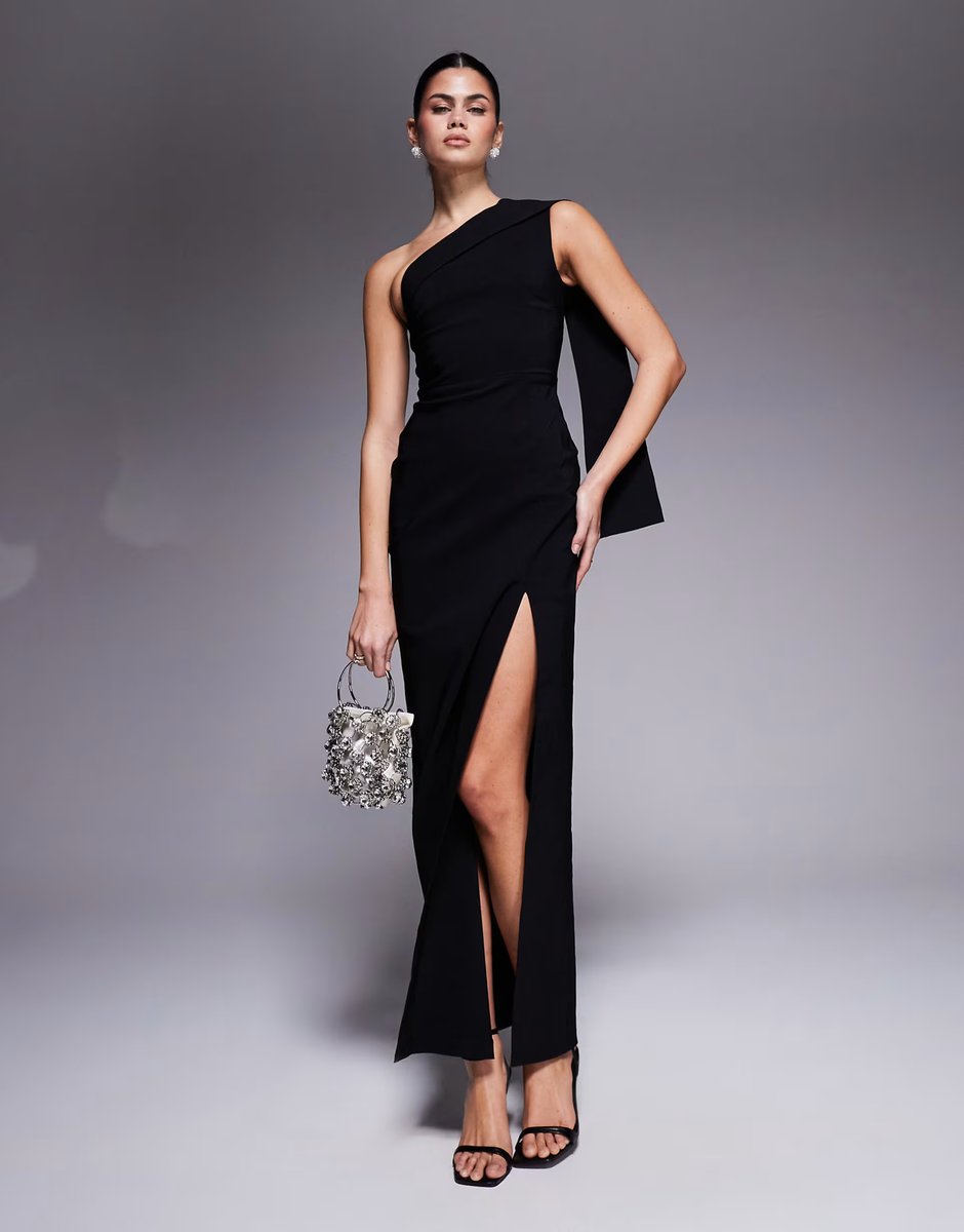 The Vesper Benglaine One Shoulder Drape Detail Side Split Maxi Dress in Black is ideal for evening, party, formal.