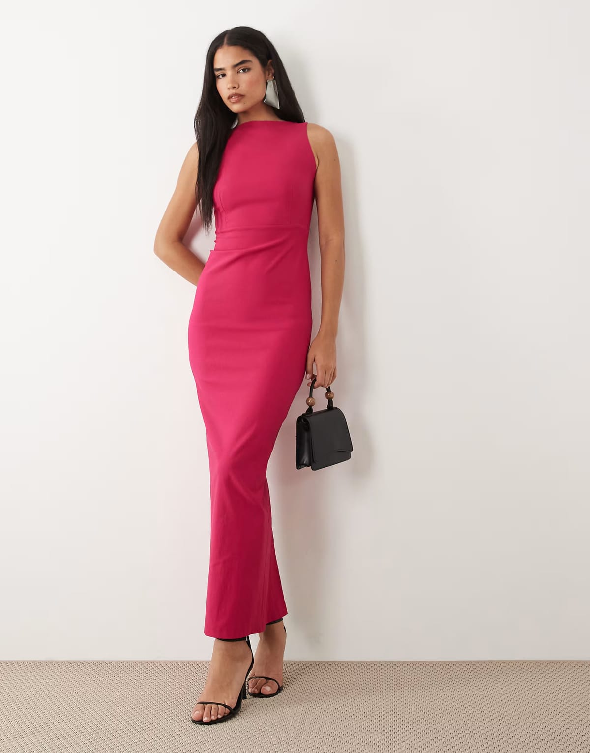 The ASOS Cerise Bengaline Open Back High Neck Maxi Dress is made from bengal.
