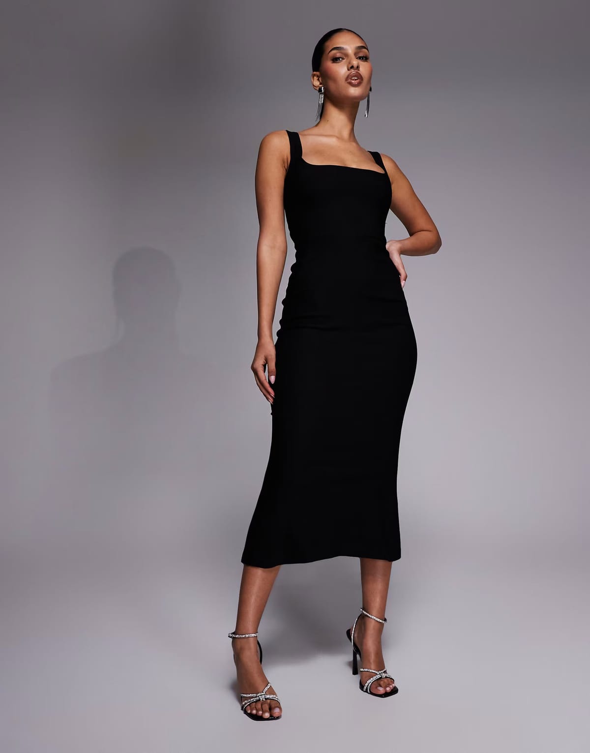 View ASOS's returns policySleek black bengaline fishtail midi dress with a square neckline and strapless design. Perfect for evening events or date nights.