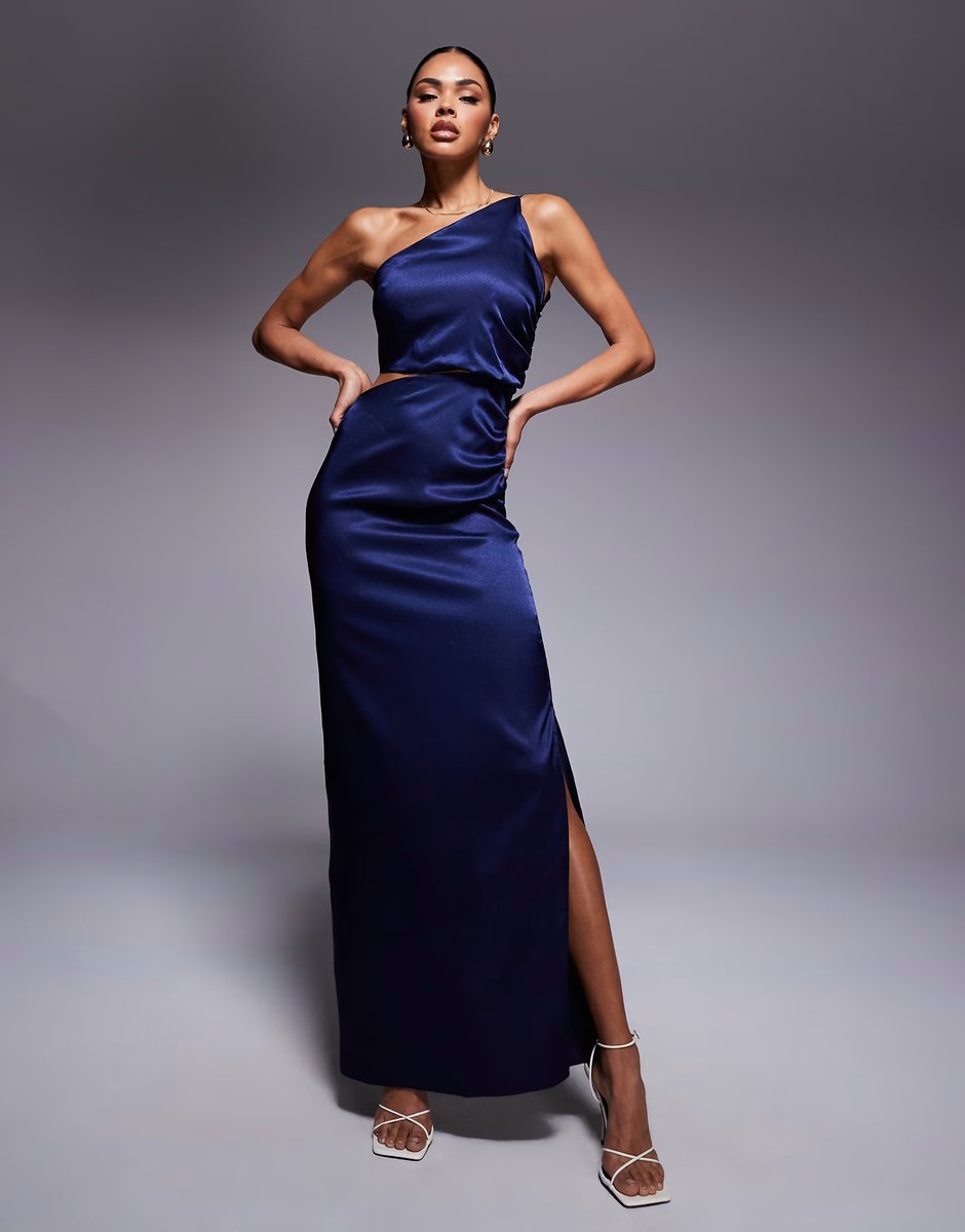 The Vesper Navy Satin One Shoulder Ruched Maxi Dress is ideal for evening, formal, party.