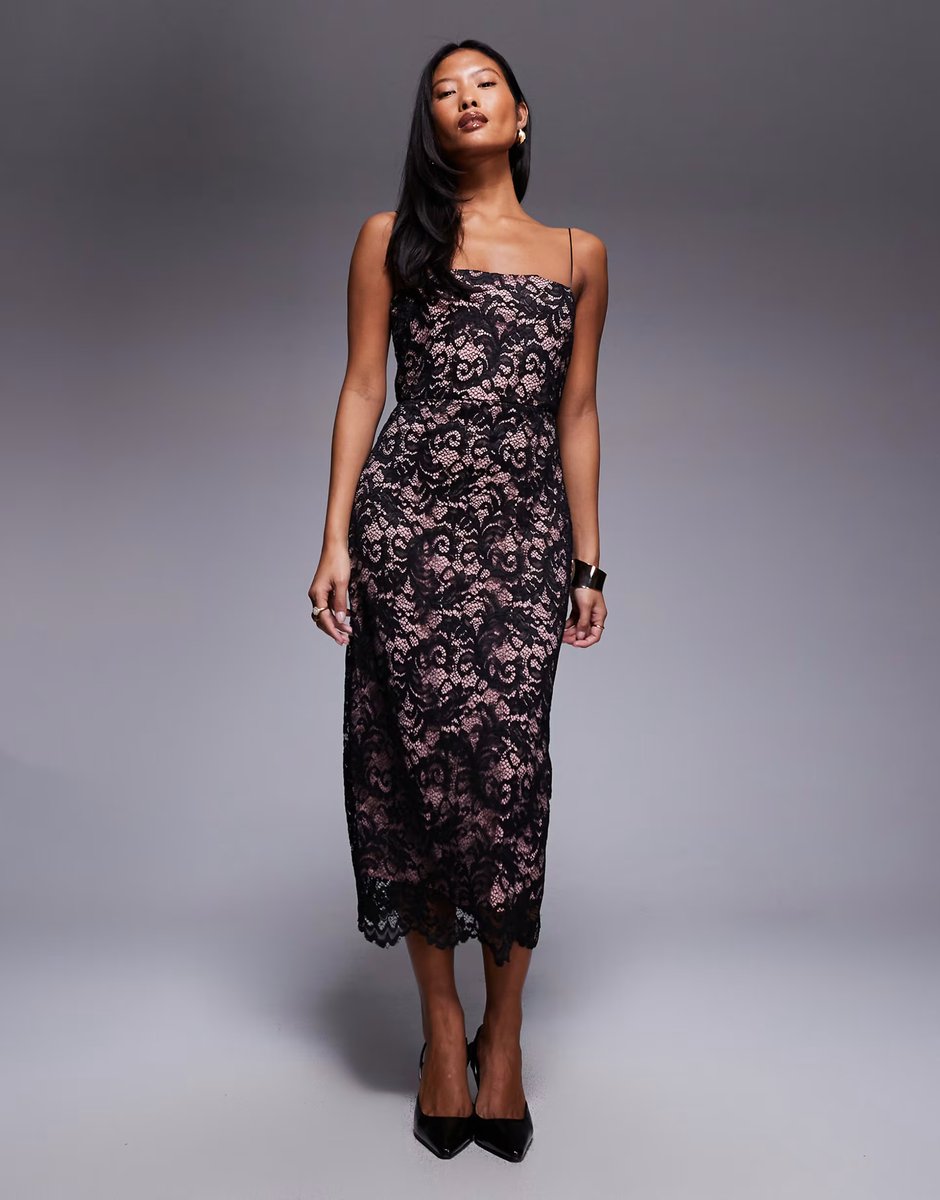 The ASOS Petite Lace Midi Dress with Spaghetti Straps in Black is ideal for evening, special occasions.