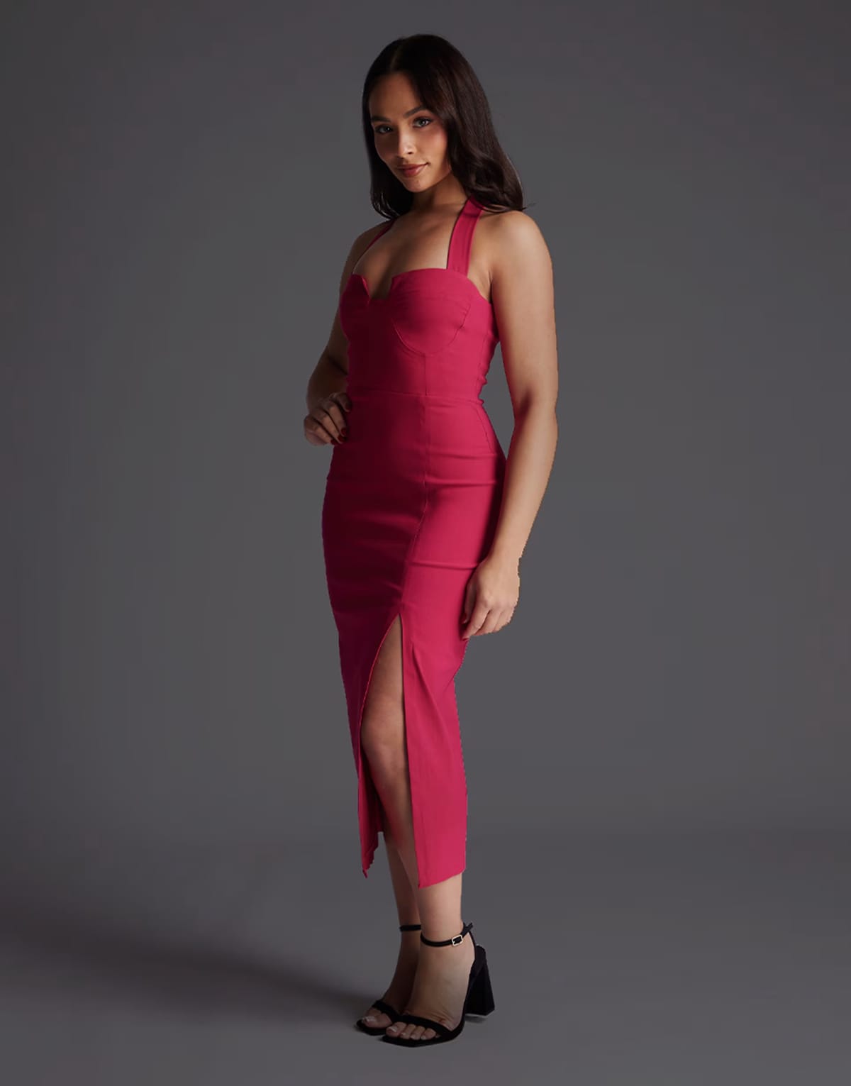 Striking cerise midi dress featuring a notch neckline and a thigh-high side split. The bodycon fit accentuates your curves, perfect for evening events or special occasions.