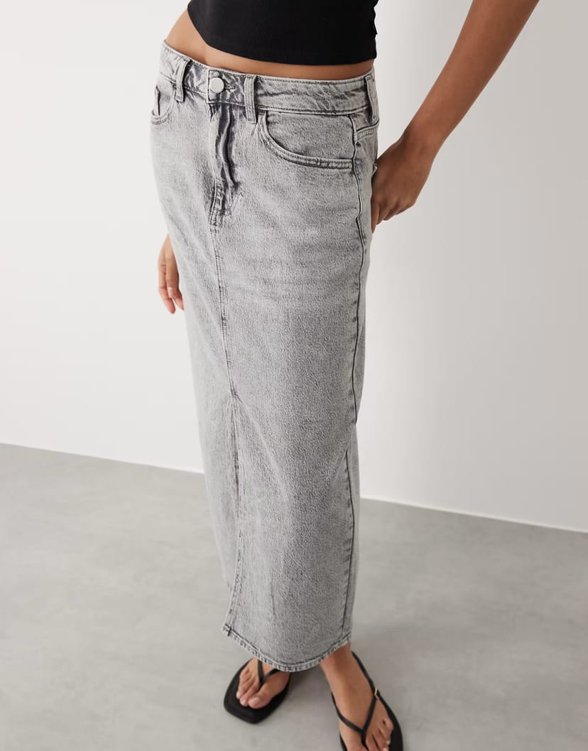 See all outfit ideasStylish Vila high waisted midi skirt in light grey denim. Features a front split and a high waisted fit for a flattering silhouette. Ideal for casual outings or smart-casual looks.