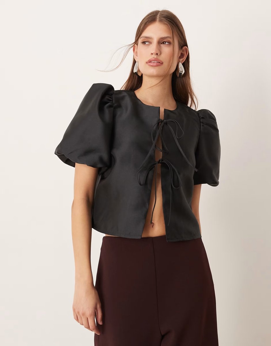 The ASOS Vila Tie Front Volume Sleeve Blouse in Black is available in sizes XXXL, XXL, XL, XS, L, M, S.
