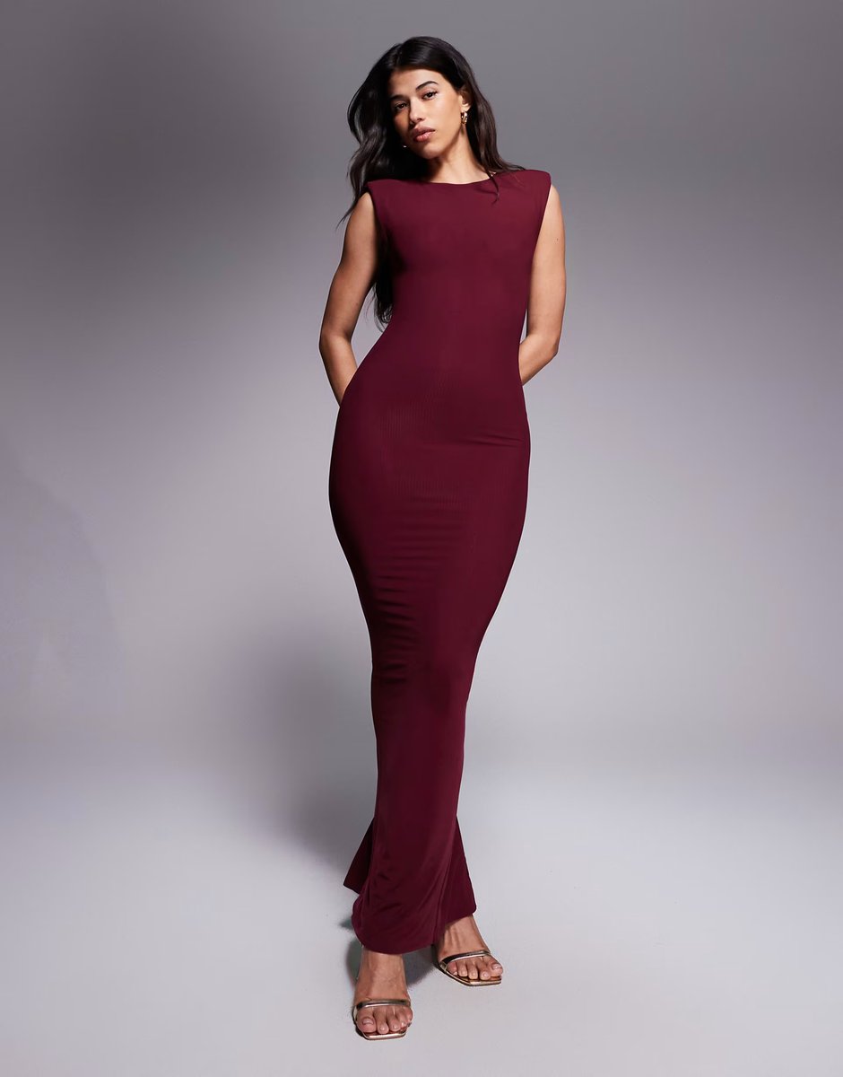 Vibrant wine-colored maxi dress — the perfect choice for evening events and parties. Designed in wine, this sleeveless bodycon dress features a sculpting silhouette and a square neckline. Crafted from lightweight ribbed stretch material with shoulder pad detailing, it offers a flattering and elegant look. Perfect for evening events and parties, this dress ensures you stand out in style.