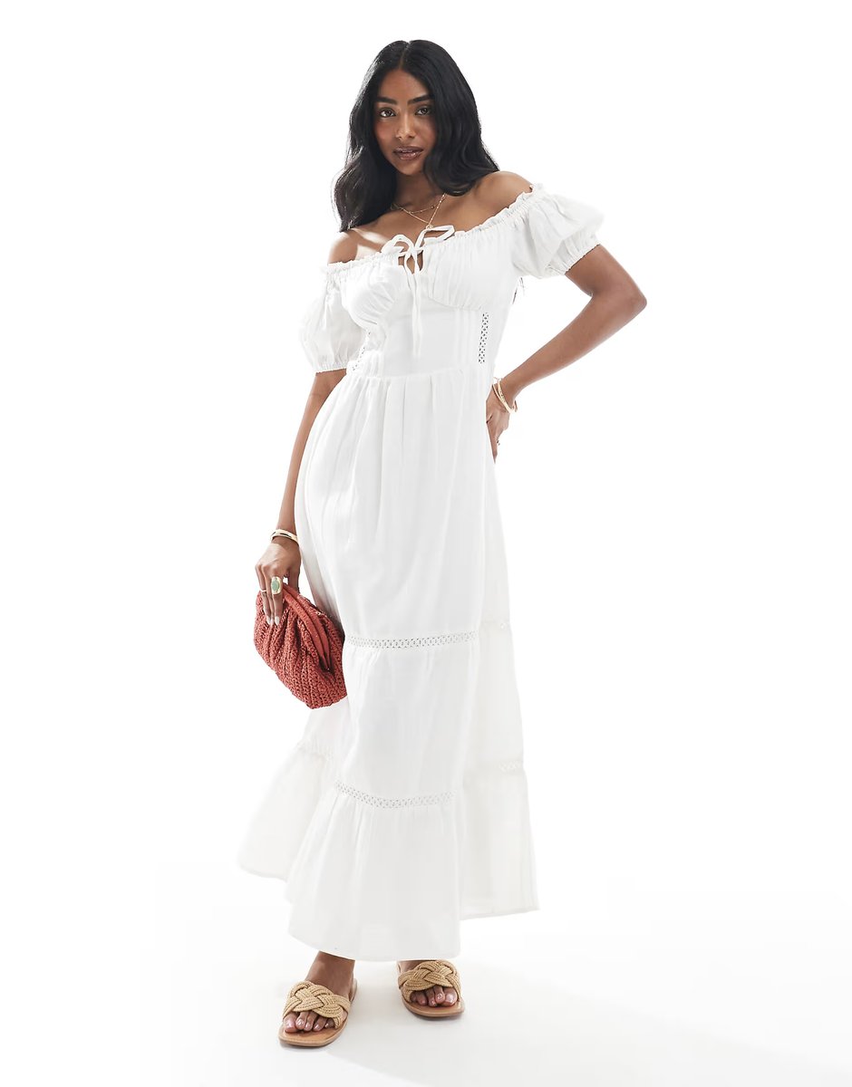The ASOS Wednesday's Girl Crochet Bardot Midi Dress in White is ideal for casual, beach, date-night.