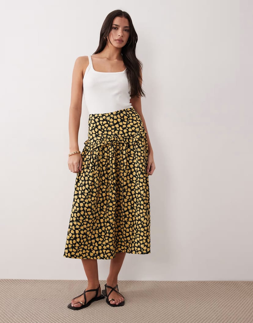 The ASOS Yellow Floral Ruffle Midi Skirt is ideal for casual, outings, summer events.
