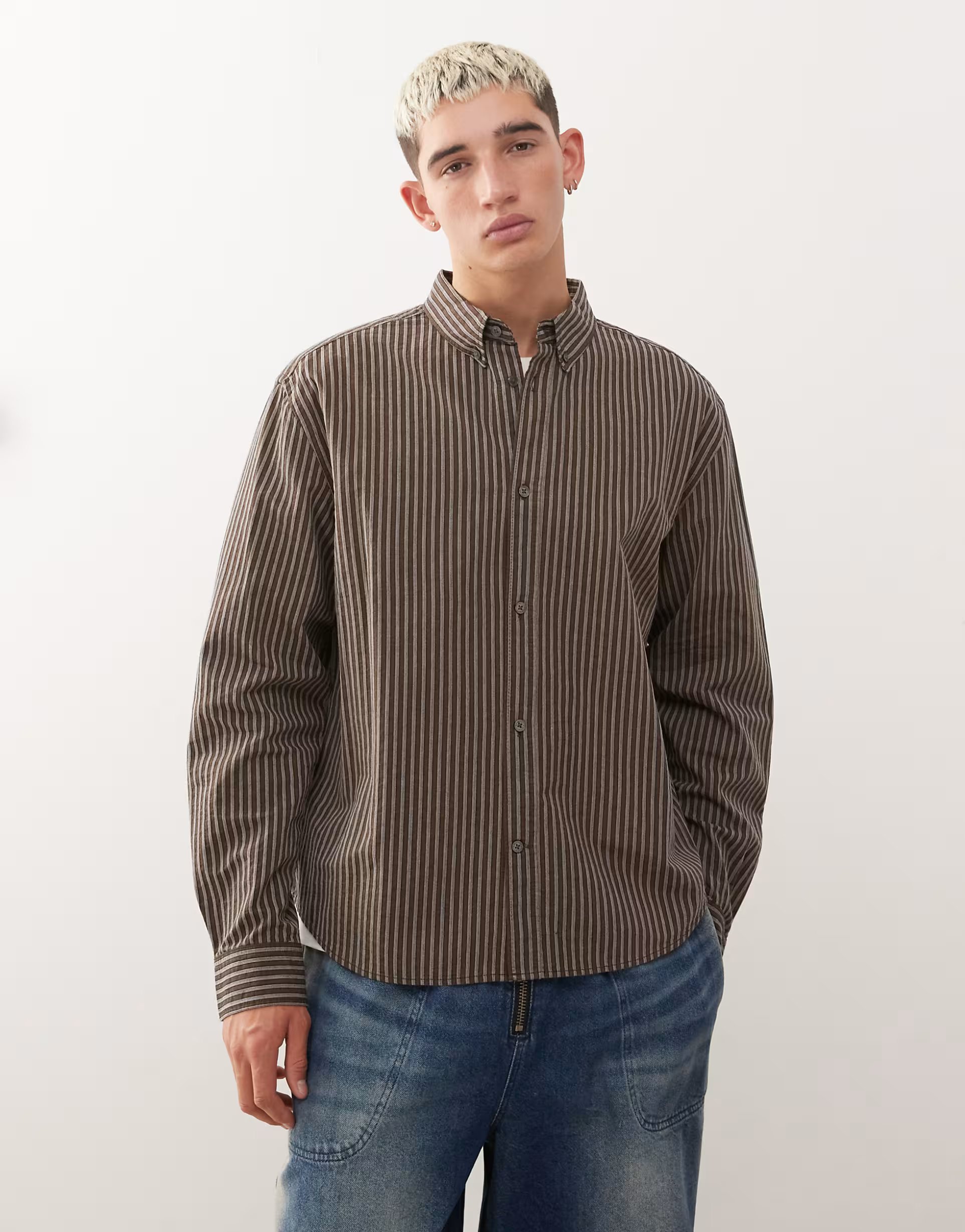 The ASOS Weekday Oversized Long Sleeve Shirt in Brown Stripe is ideal for casual.