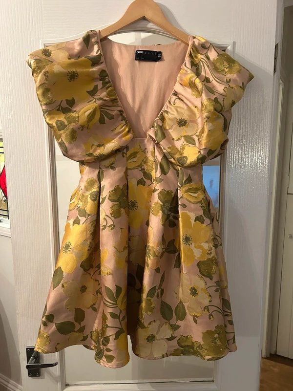 The ASOS Floral Print Midi Dress in Mustard is available in sizes M.