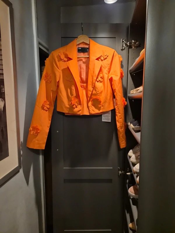 This vibrant coral blazer from ASOS is a standout piece for any wardrobe. Designed with a satin finish, it features a cropped silhouette and floral embellishments for a touch of femininity. Perfect for adding a pop of color to your outfit, this blazer is ideal for casual outings and daytime events.