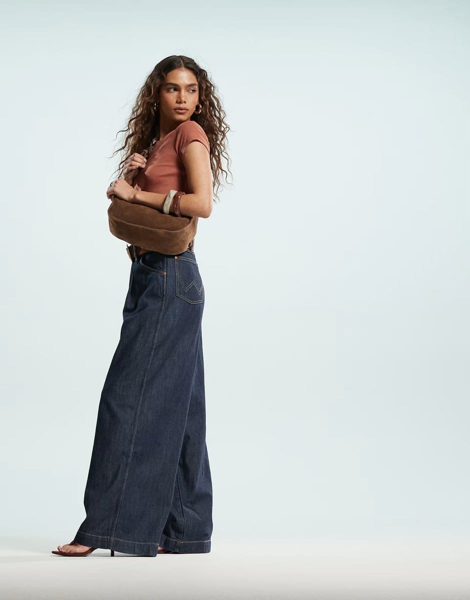 The ASOS Wrangler Co-ord Denim Pleated Wide Leg Trouser in Dark Blue is available in sizes XXXL, XXL, XL, XS, L, M, S.