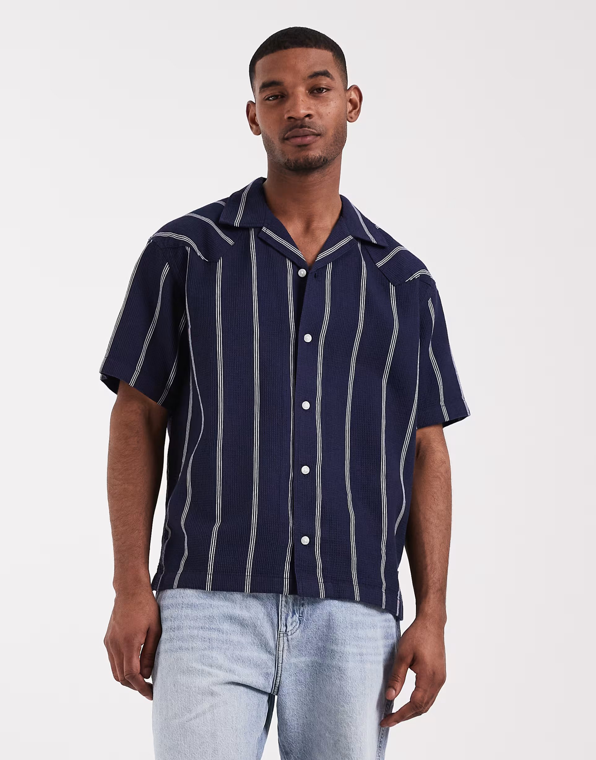 The ASOS Wrangler Navy Resort Shirt with Stripes is available in sizes XXXL, XXL, XL, XS, L, M, S.