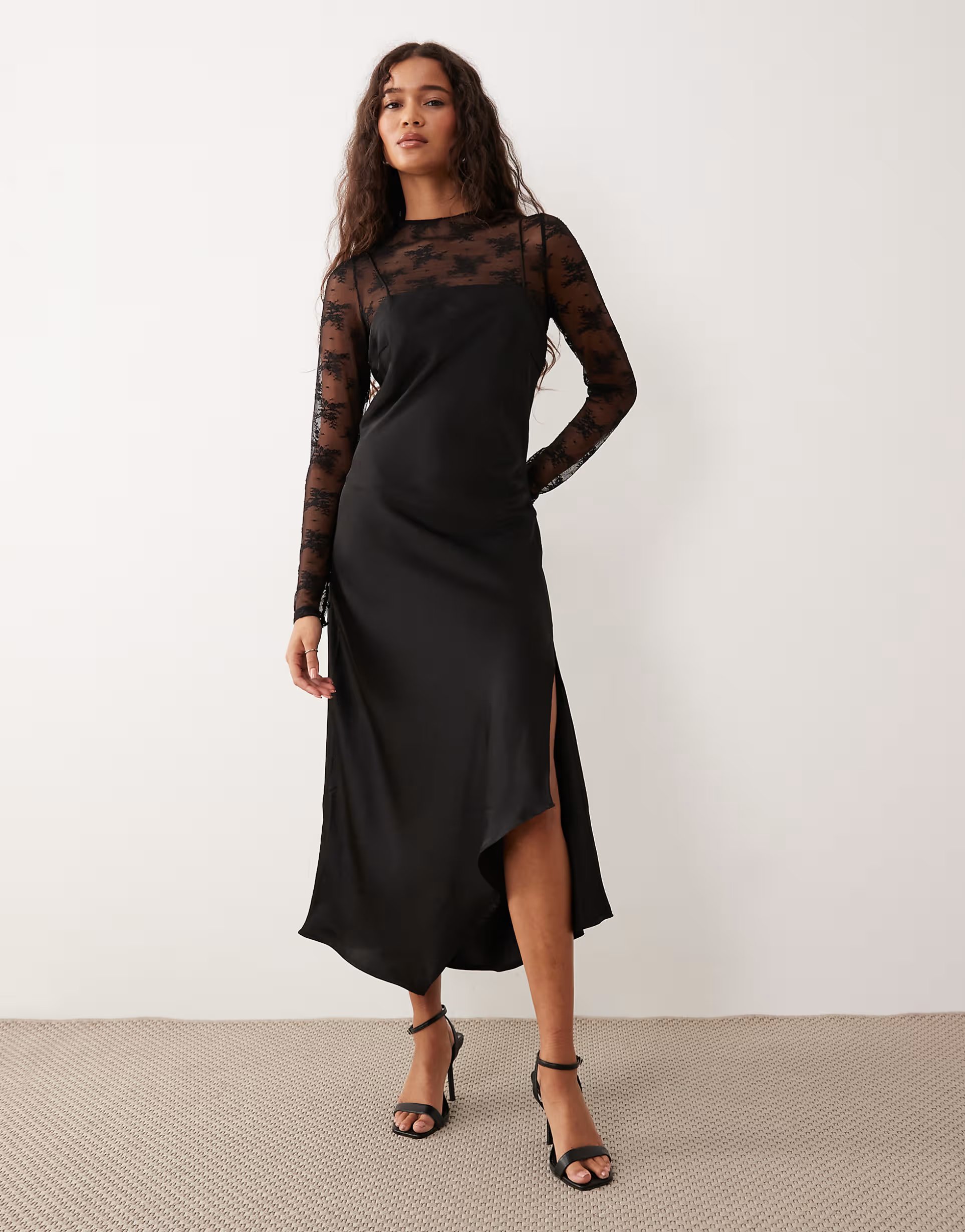 The black YAS hybrid high neck lace top and satin slip dress by ASOS features a high neck, lace detailing, and satin slip dress in a versatile black hue. Perfect for evening or formal events.