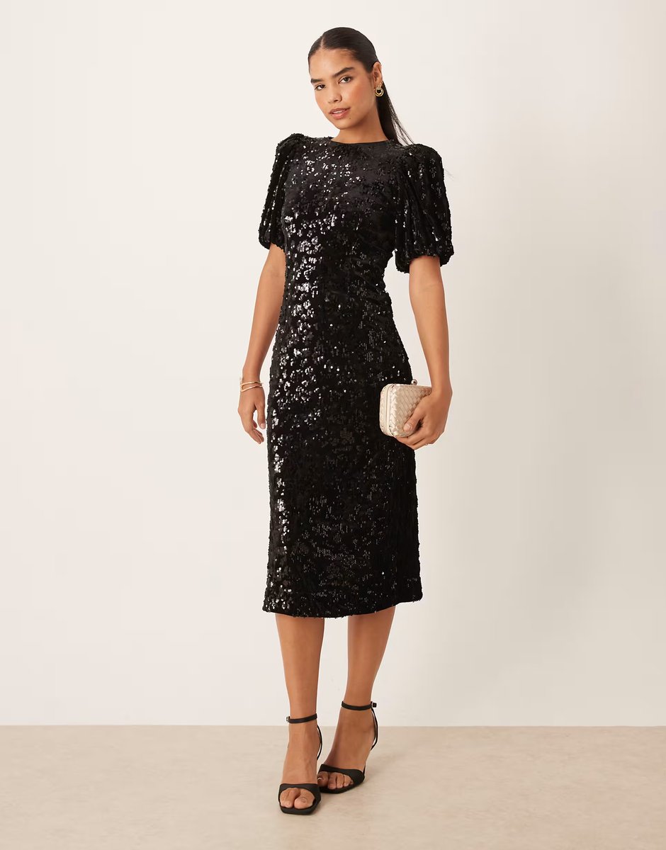 The ASOS Puff Sleeve Sequin Midi Dress in Black is ideal for evening, formal, date-night.