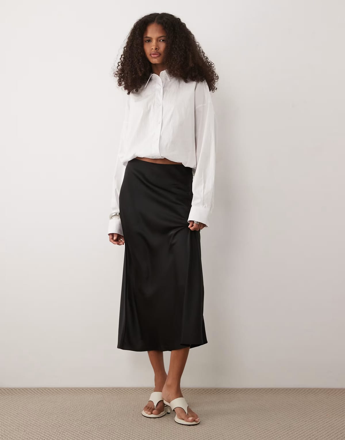 The ASOS Black Satin Midi Skirt is ideal for evening, casual, work.