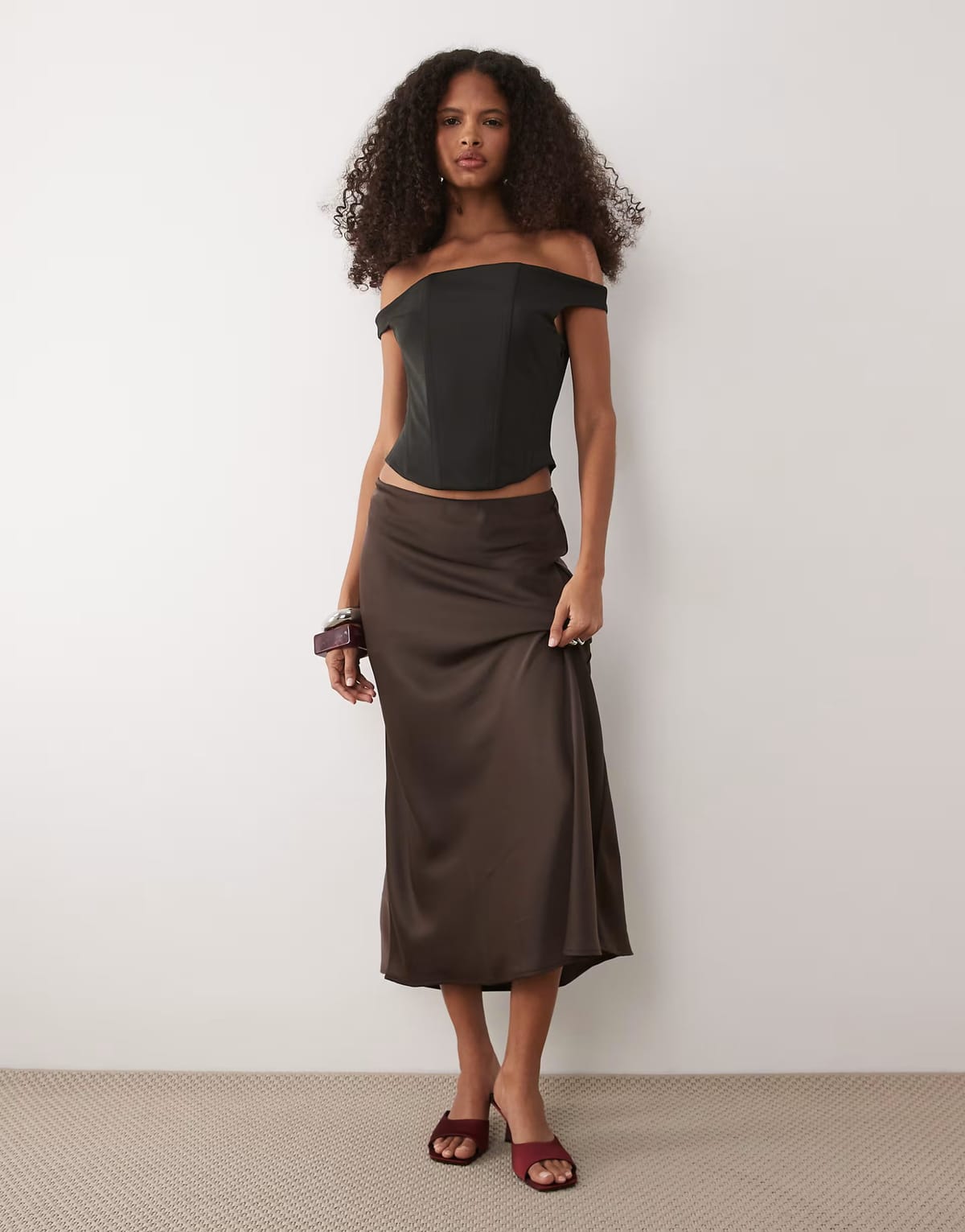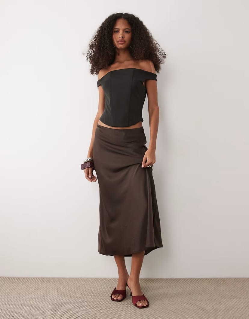 The ASOS Chocolate Brown Satin Midi Skirt with Black Off-Shoulder Top is ideal for evening, date-night, party.