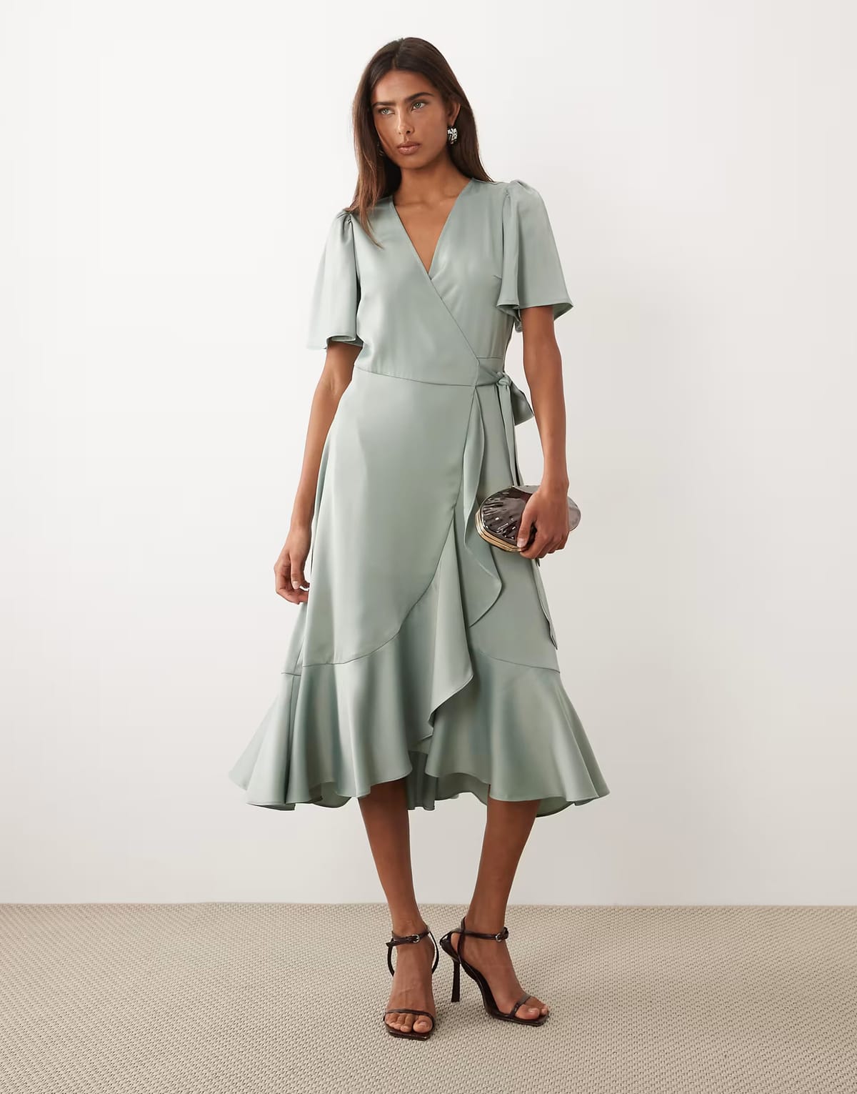 The ASOS Sage Green Satin Wrap Midi Dress is ideal for evening, formal, party.
