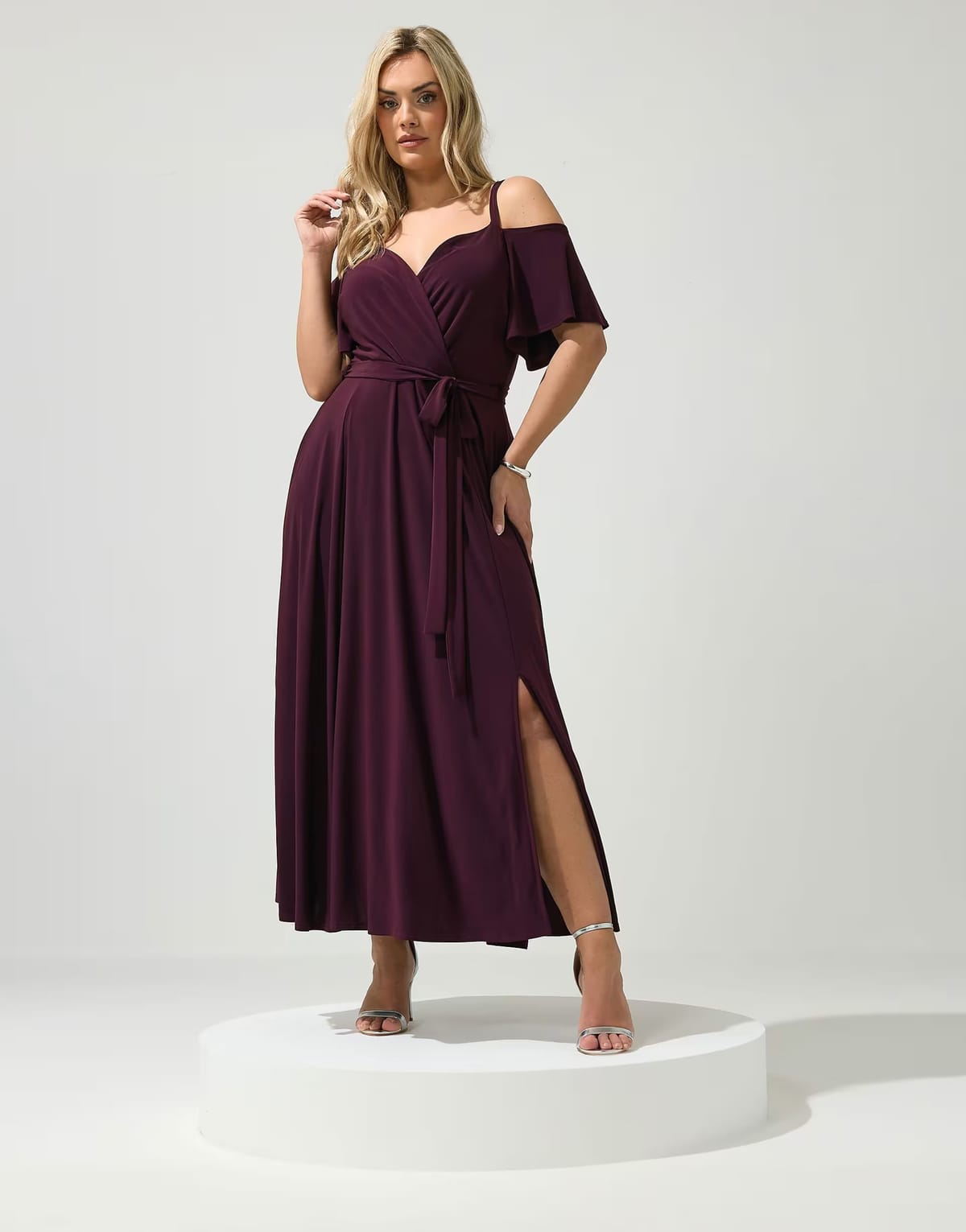 Stylish maxi dress in purple featuring a cold shoulder neckline and a wrap-around belt. The flowing skirt adds a touch of elegance, perfect for evening events.