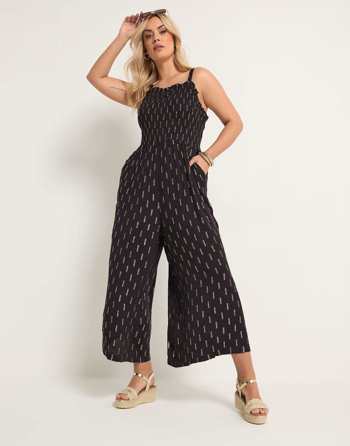 Stylish black metallic wide leg jumpsuit by ASOS. Features a strapless neckline, adjustable straps, and a full-length silhouette. Perfect for evening events or casual outings.