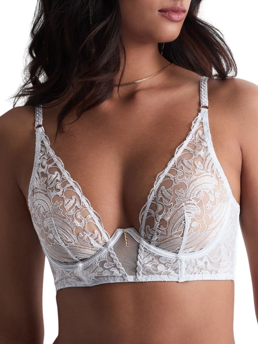 Delicate blue lace bustier by Aubade, featuring underwire support, triangle plunge cups, and sheer embroidered cups. The satin accents and intricate French embroidery add a touch of elegance. Ideal for special occasions or as a luxurious addition to your lingerie collection.