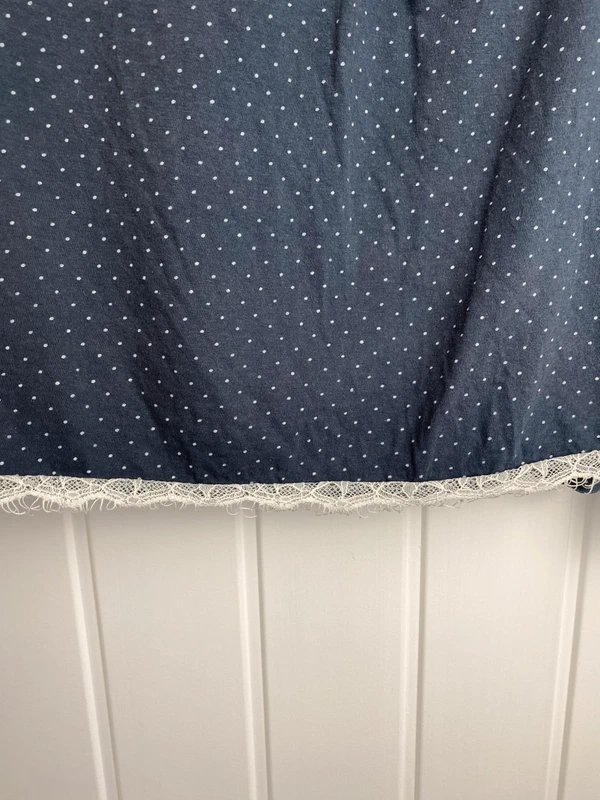 Comfy Avon pyjama cami top in a navy/grey colour with a cute polka dot print. Featuring adjustable straps for a better fit and a soft cotton fabric, perfect for lounging or sleepwear. Lace trim detail along the hem adds a nice touch.