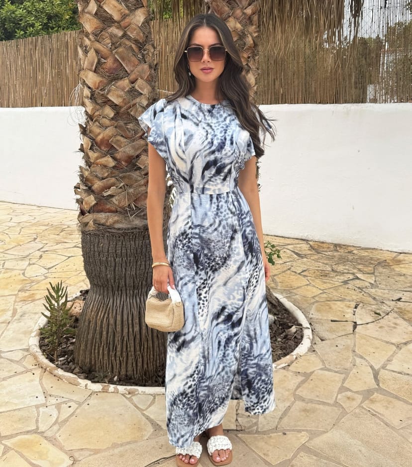 Striking blue animal print midi dress by AX Paris. The fitted silhouette is enhanced with flutter sleeves and a hem slit. Ideal for summer soirées or garden parties.