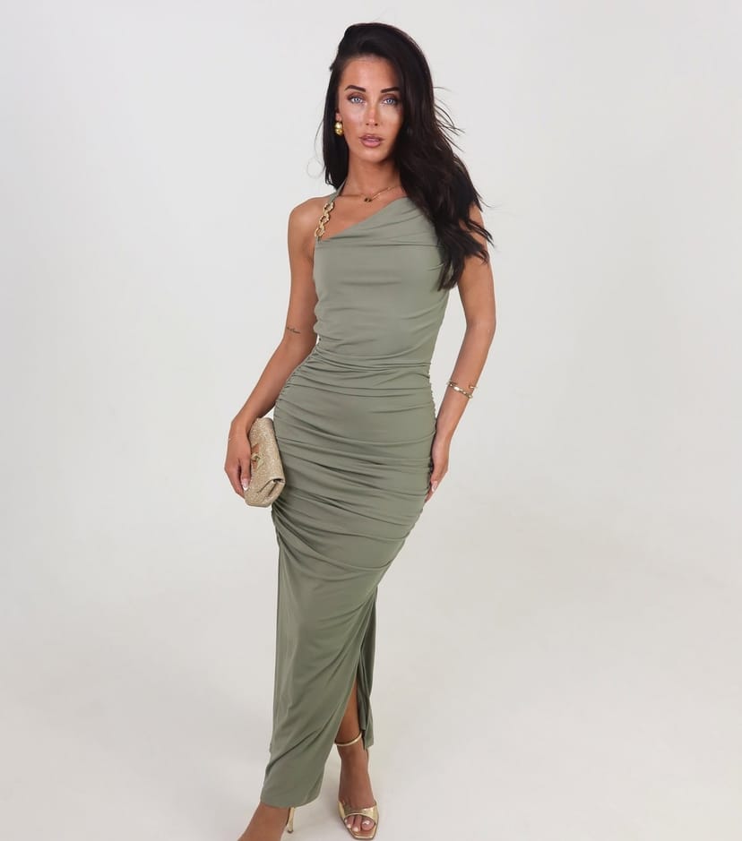 This elegant one-shoulder midi dress from AX Paris is perfect for glam evenings. Its slinky jersey fabric and ruched seams create a flattering fit, while the chain strap adds a touch of luxury. Ideal for evening events or date nights.