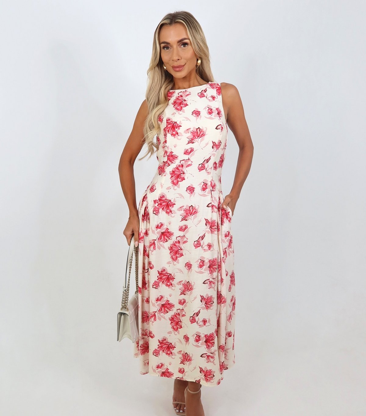 This AX Paris midi dress features a floral print in shades of cream and pink. It has a slash neckline and voluminous pleats on the hip for a full silhouette. Ideal for summer occasions.