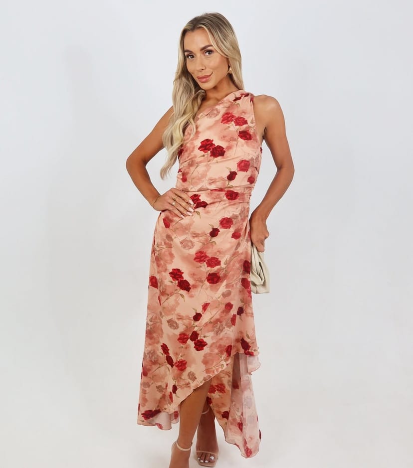 This pink rose print one-shoulder midi dress by AX Paris is perfect for special occasions. Featuring a draped asymmetric hem and a vibrant rose pattern, it's ideal for garden parties and evening soirées.