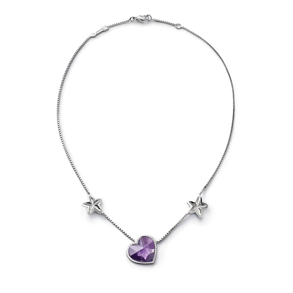 Elegant purple crystal heart necklace in sterling silver. The heart pendant is surrounded by two star accents, creating a romantic and luxurious look. Perfect for special occasions or as a statement piece.