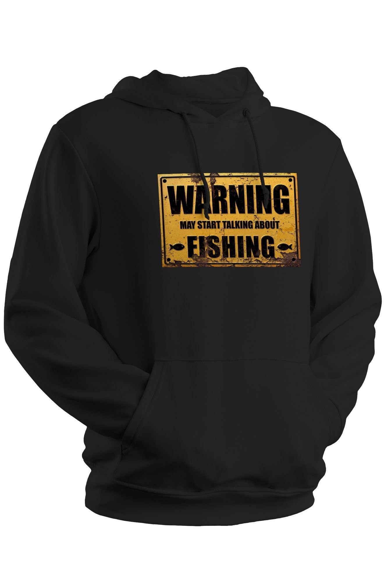This black hoodie features a distressed/rusty warning sign graphic, making it an ideal gift for a fisherman. Made from soft 80% ringspun cotton and 20% polyester, it offers a relaxed fit and includes a front pouch pocket. Vegan PETA Approved.