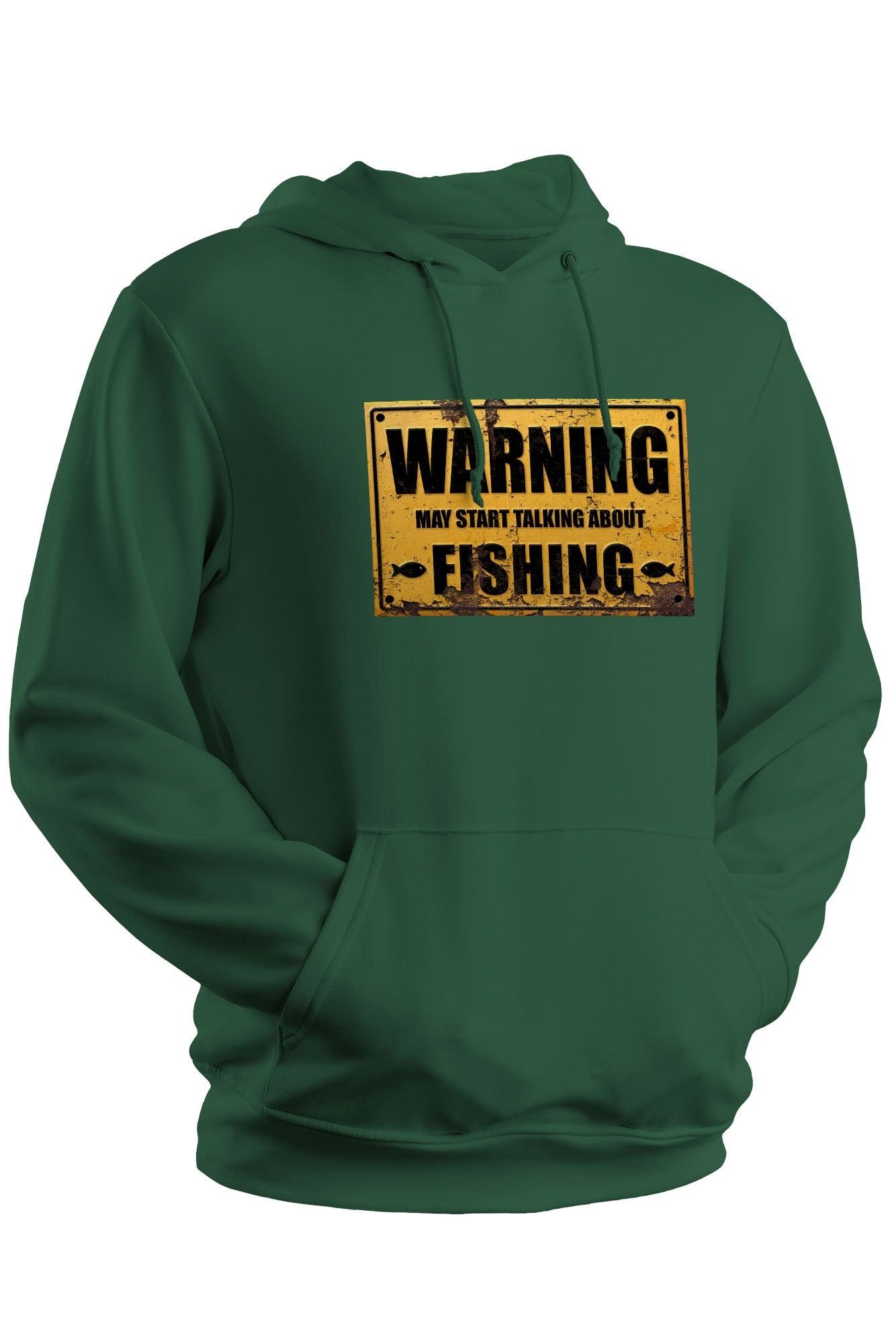 This pullover hoodie in bottle green features a distressed/rusty warning sign print, making it an ideal gift for fishing enthusiasts. Made from soft 80% ringspun cotton and 20% polyester, it offers a relaxed fit and includes a front pouch pocket.