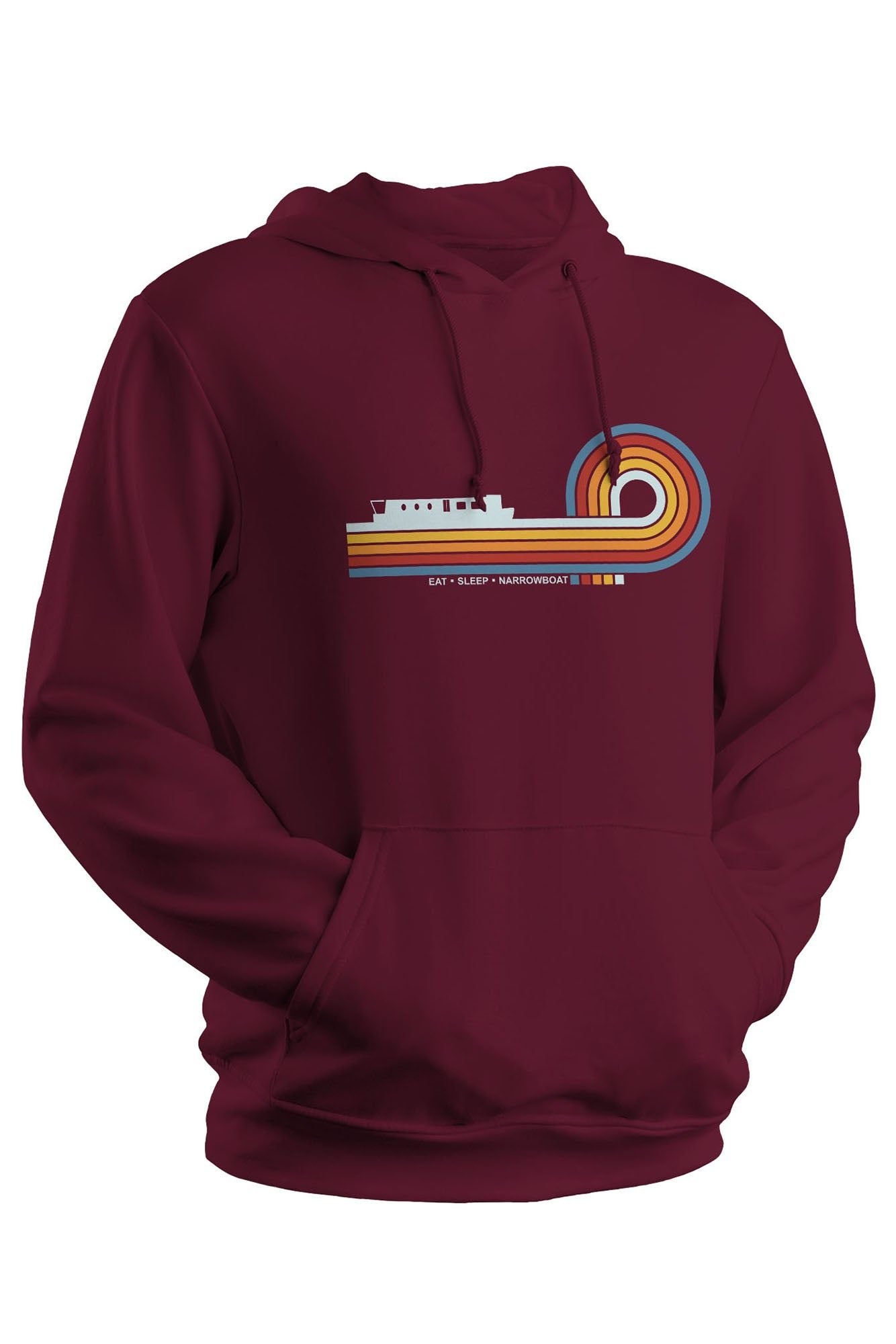 The Bad Zebedee Burgundy Retro Lines Narrowboat Hoodie is available in sizes 2XL, L, M, S, XL, XS.