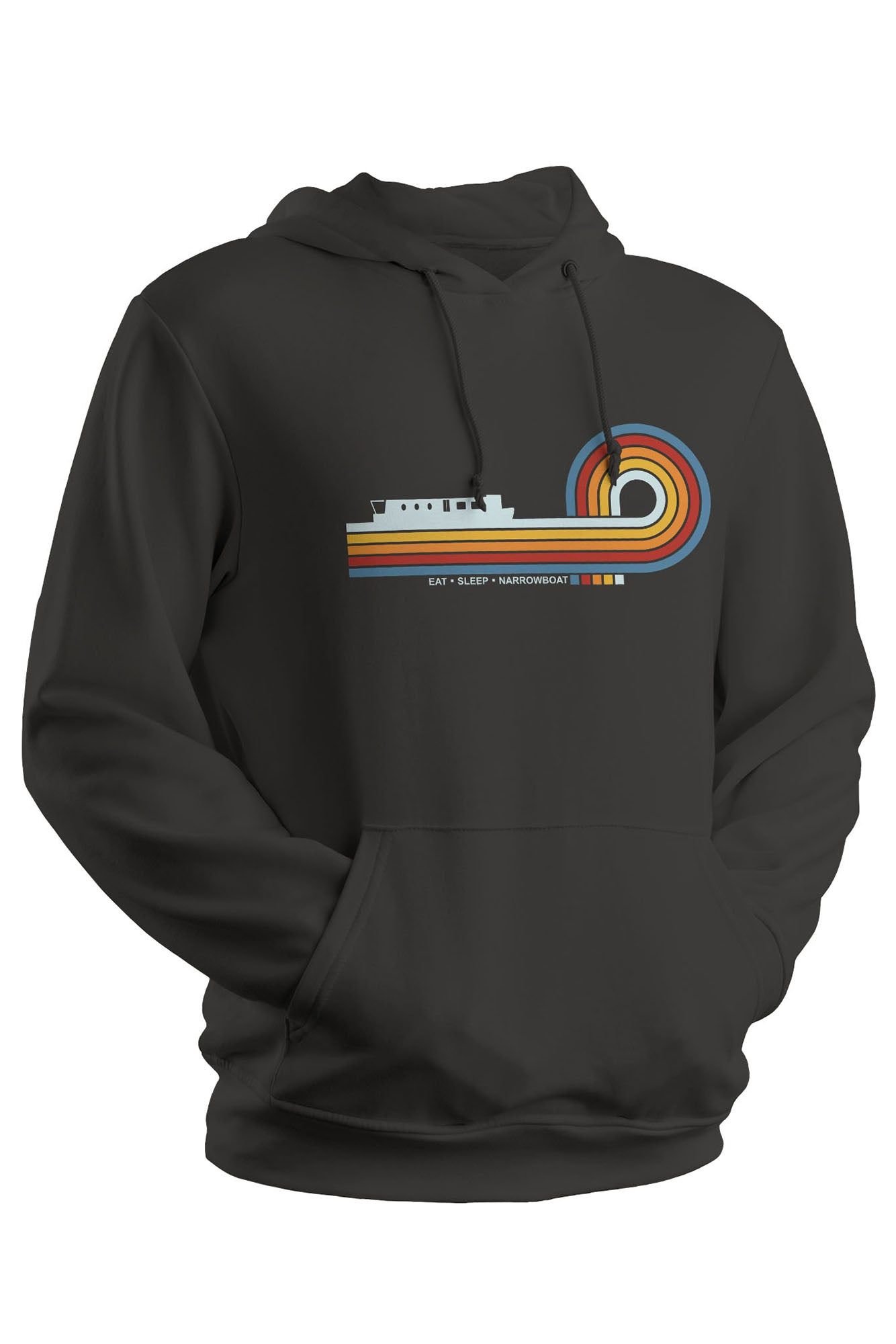 A soft hoodie with a retro style design of a narrowboat and the text 'Eat Sleep Narrowboat' underneath. Perfect for narrowboat enthusiasts. Made from 80% ringspun cotton and 20% polyester.