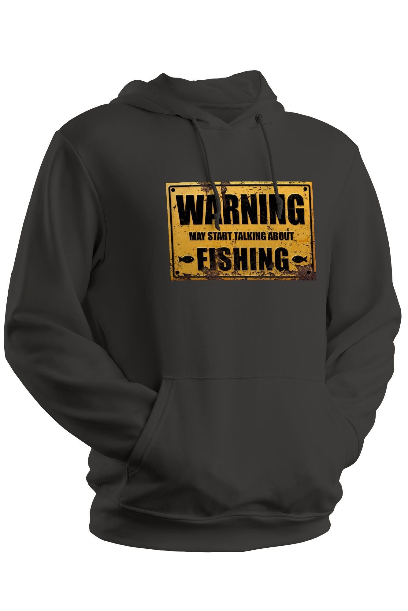 This grey hoodie features a distressed/rusty warning sign graphic, making it an ideal gift for a fisherman. Made from soft 80% ringspun cotton and 20% polyester, it offers a relaxed fit and includes a front pouch pocket.