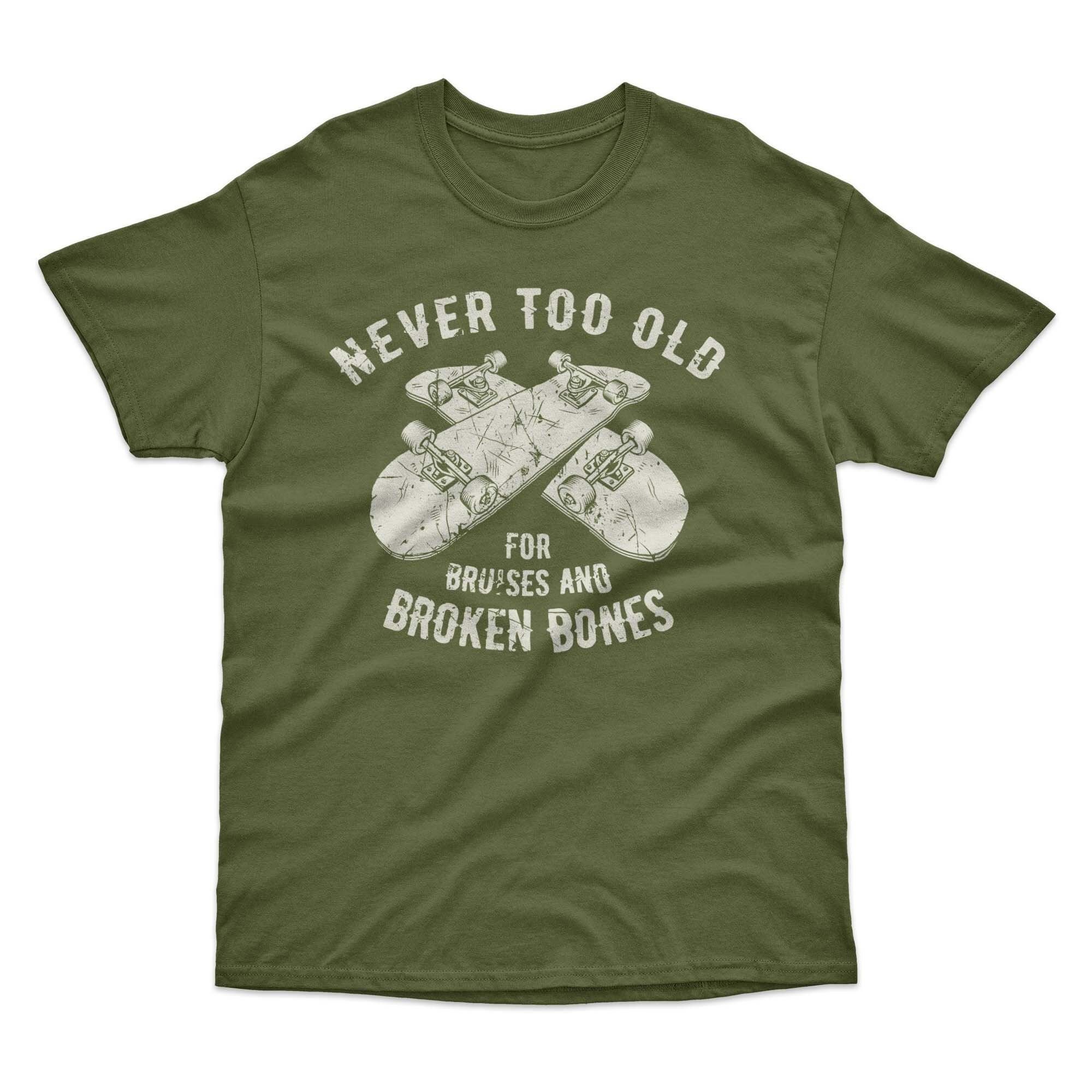 This Khaki Bad Zebedee t-shirt features a distressed/vintage look print that reads 'Never Too Old for Bruises and Broken Bones'. Made from 100% cotton, it offers a standard fit and is OEKO-TEX, Amfori, Vegan, and Fair Wear approved. Ideal for casual wear.