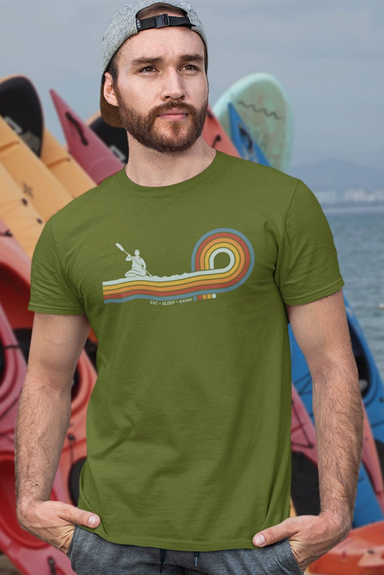 Retro 70s inspired kayaking t-shirt in khaki with the legend Eat Sleep Kayak. Perfect for kayaking or canoeing enthusiasts. Made from 190gsm soft ring spun semi-combed 100% cotton, this standard fit crew neck, short sleeve t-shirt is OEKO-TEX, Amfori, Vegan, and Fair Wear approved.