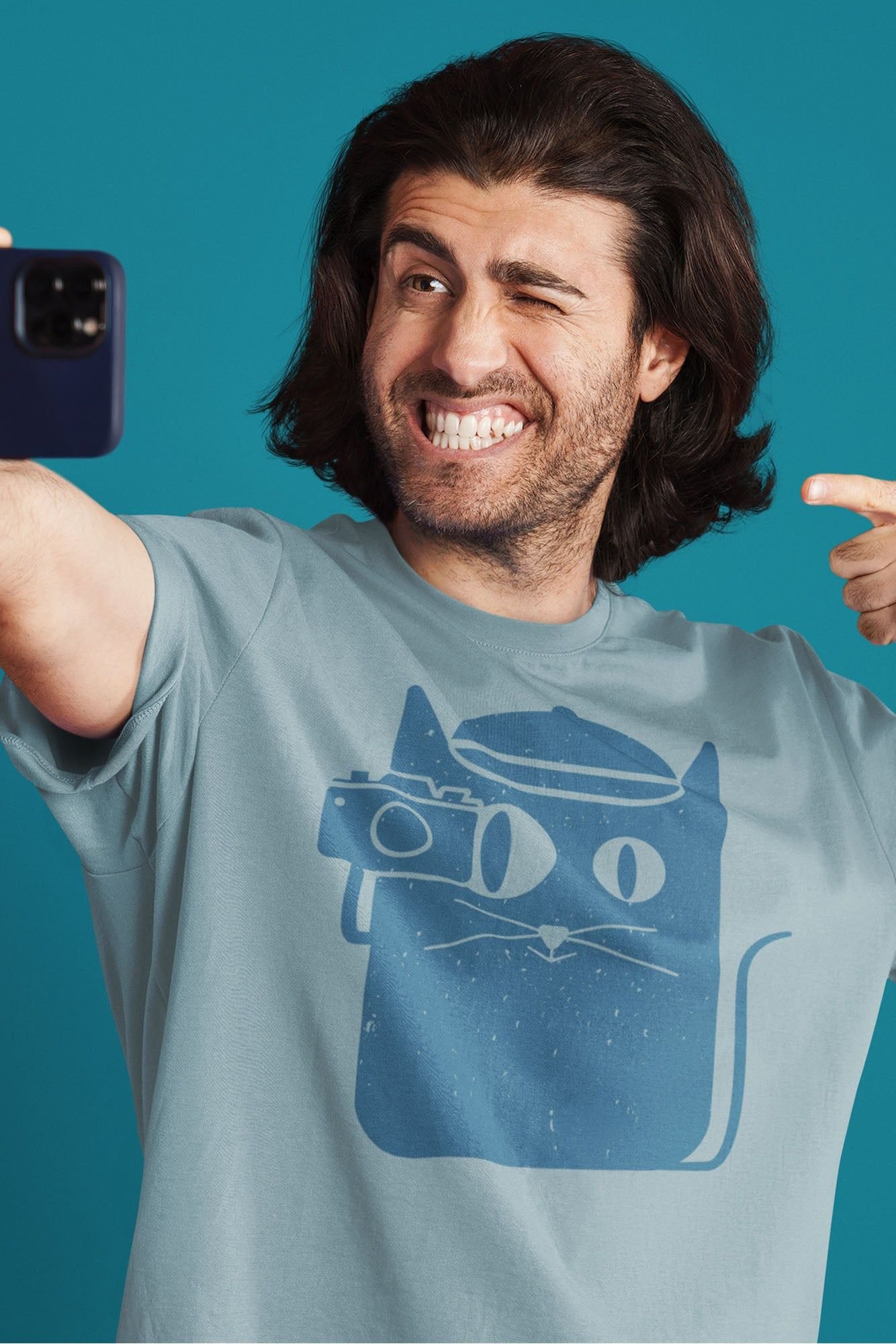 The Bad Zebedee Light Blue Cat Photographer T-Shirt is ideal for casual, everyday, outings.