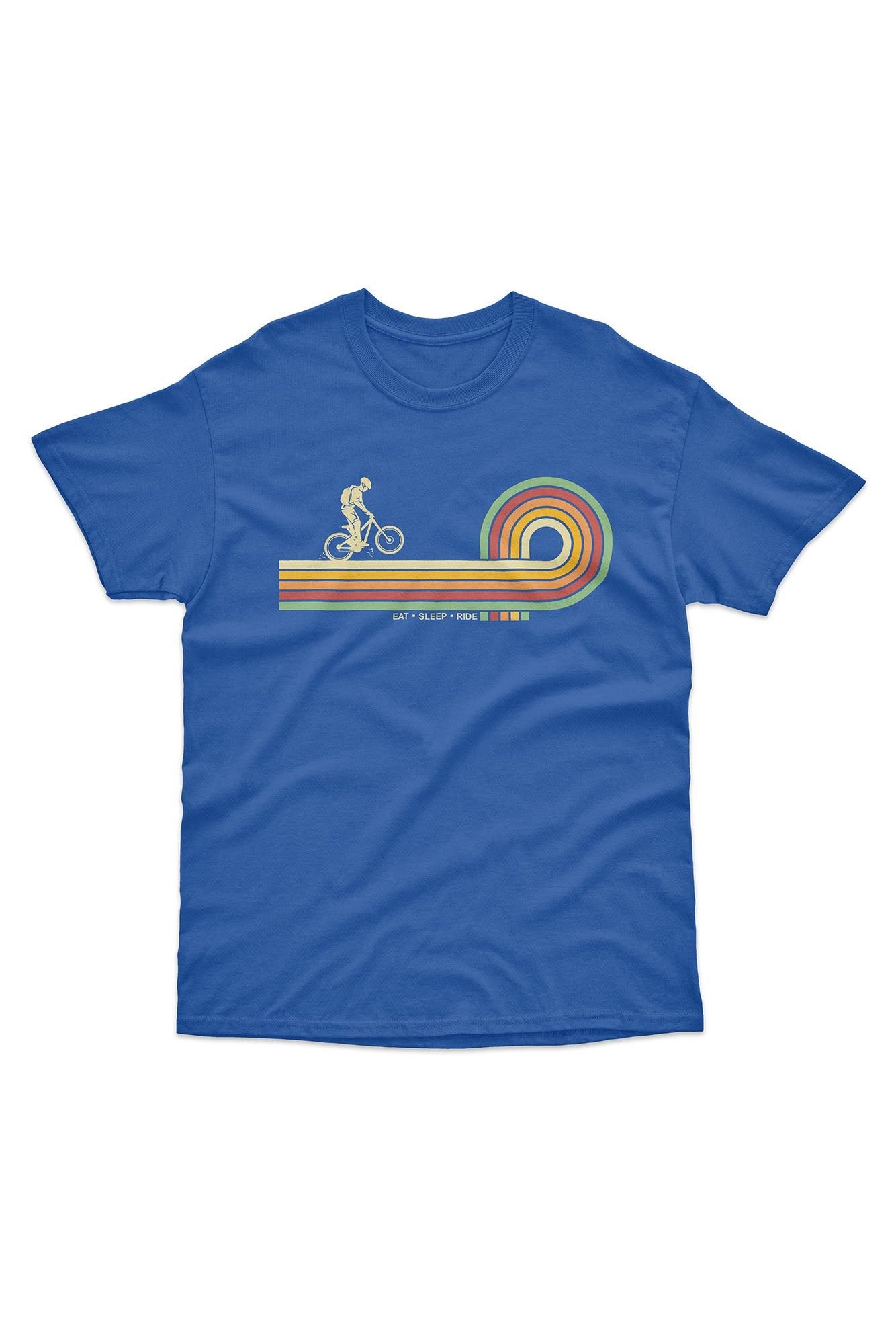 Retro-inspired Bad Zebedee mountain bike t-shirt in royal blue. Features a vintage 70's design with 'eat - sleep - ride' printed underneath a mountain biker graphic. Made from 190gsm soft ring spun semi-combed 100% cotton, this crew neck, short sleeve t-shirt is perfect for casual wear.