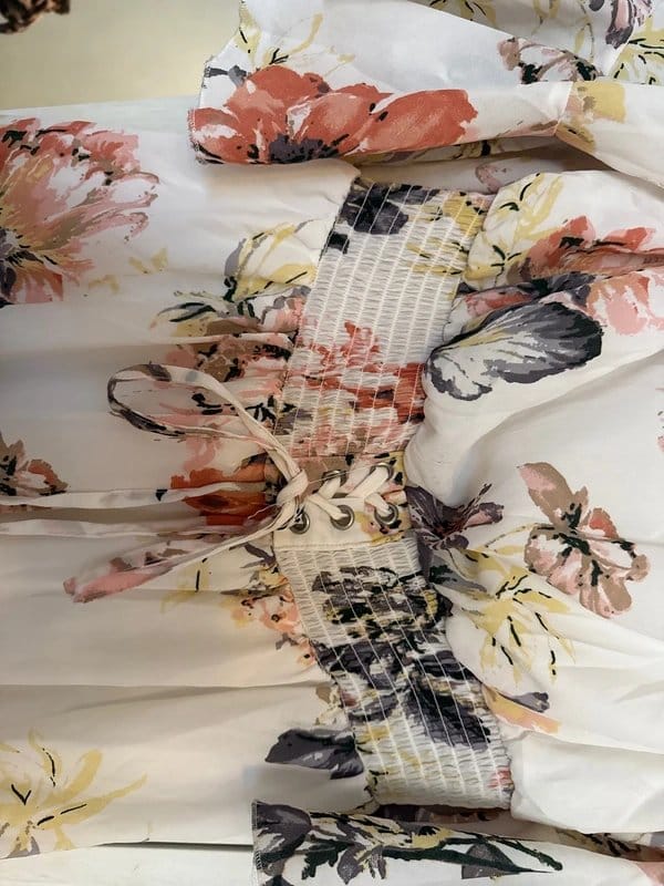 This Bailey Blue dress features a floral print on a chiffon fabric, offering a lightweight and airy feel. The dress has a 3/4 floaty sleeve design and an elastic waist with tie details for a comfortable fit.