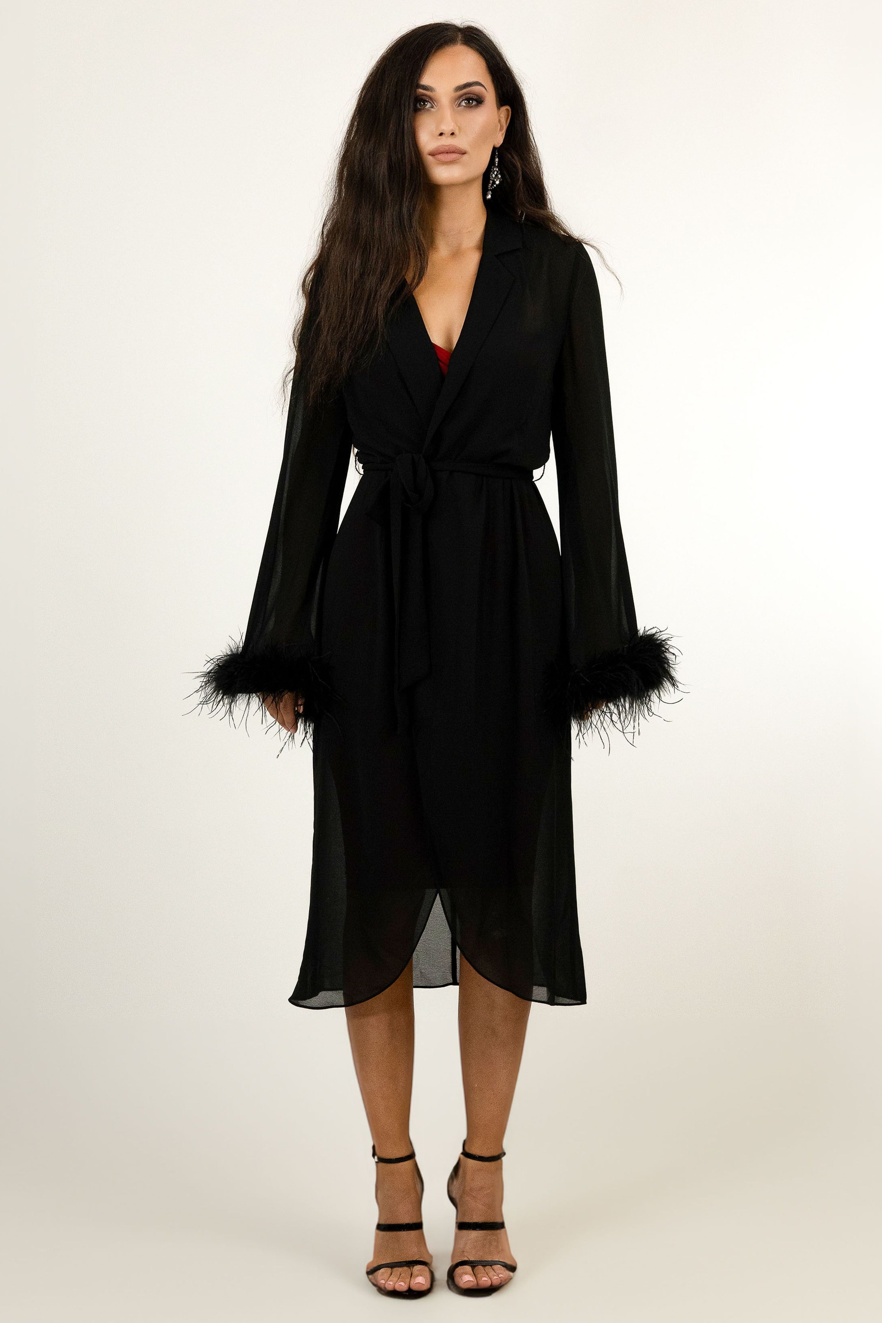 The BALOU Black Chiffon Wrap Midi Dress with Ostrich Feathers is ideal for evening, party, date-night.