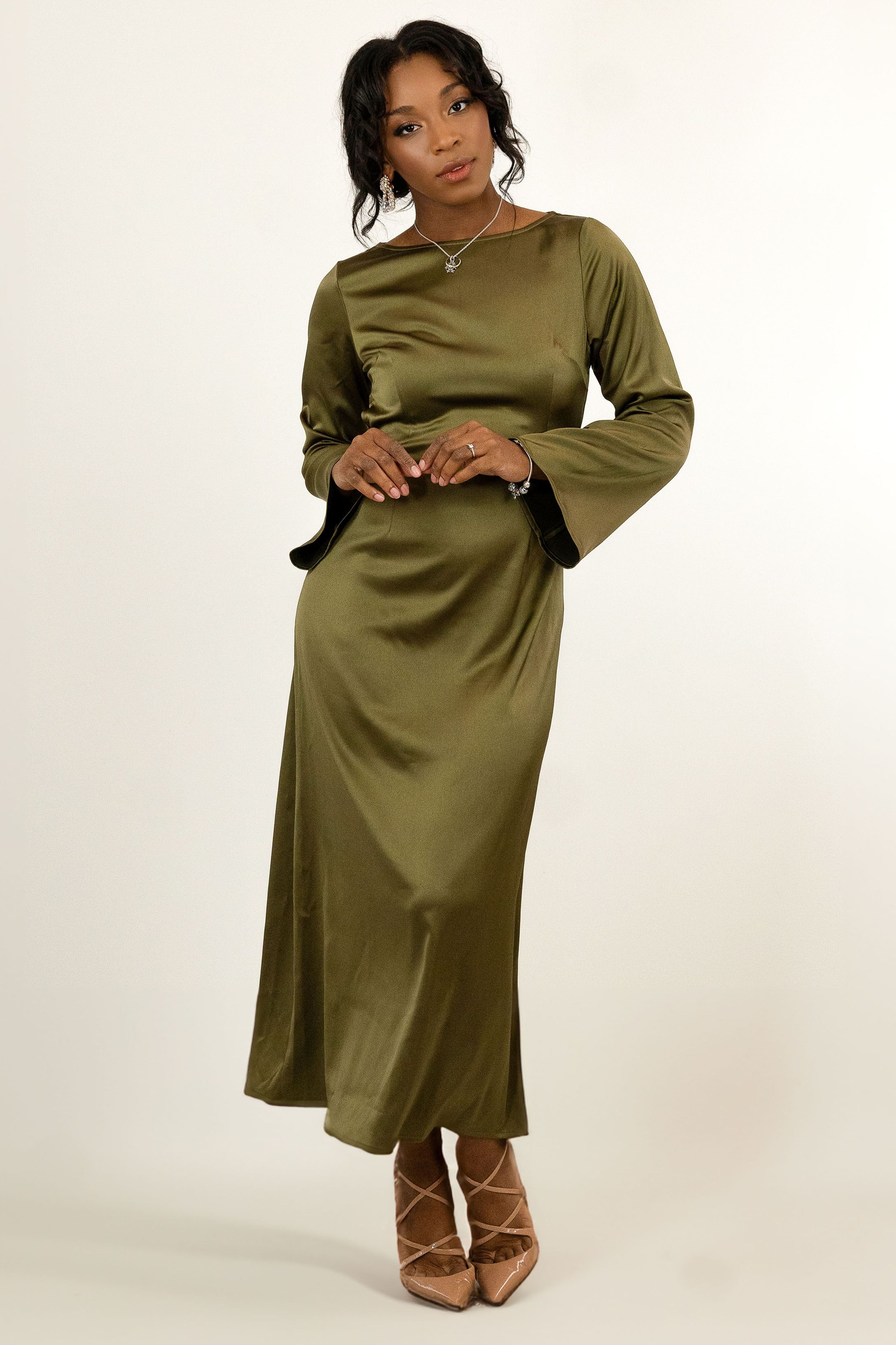 This olive silky satin midi dress features a straight high neckline, flared long sleeves, and a flattering A-line silhouette. The dress fastens with an invisible zip single back button, making it perfect for special occasions.