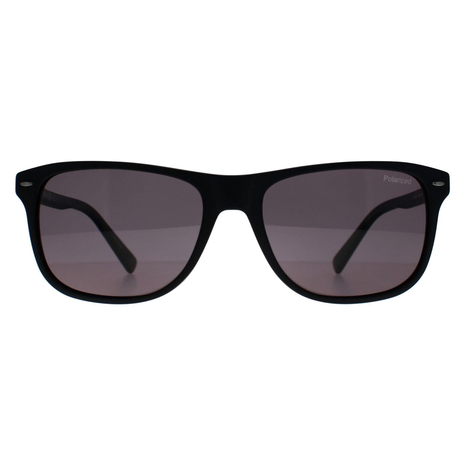 Stylish matte black grey polarized sunglasses with a flat metal frame and slim plastic temples. Perfect for reducing glare and adding a touch of sophistication to any outfit.